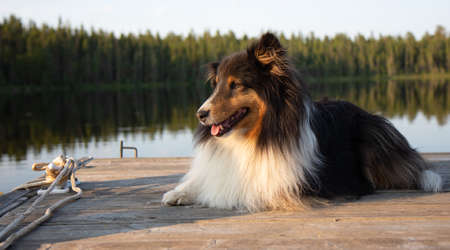 shetland sheepdog dog lying on a dock on lake looking away cute