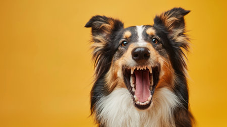 Collie, angry dog baring its teeth, studio lighting pastel background