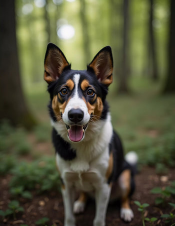 In a serene forest, a cheerful dog with striking markings sits among the vibrant greenery.