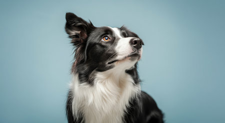 Captivating border collie portrait against soft blue background for pet enthusiasts