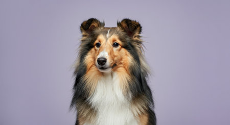 Elegant collie with majestic mane against soft purple background for pet enthusiasts
