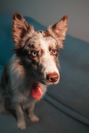 A close-up of a red merle Border Collie dog wearing a red polka dot tie, looking directly into the camera