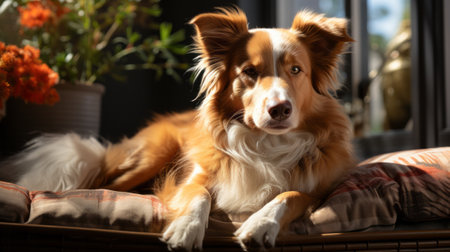 Collie dog resting calmly on a comfortable bed with golden morning light coming through the window, creating a warm atmosphere