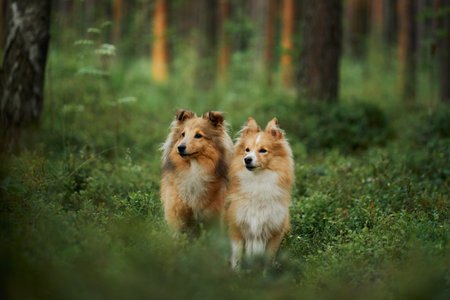 Two Collies exploring a sunlit forest