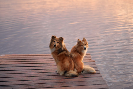 Collies sitting together during a sunset on a dock