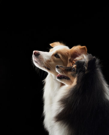 Border Collie group sitting attentively on dark backdrop