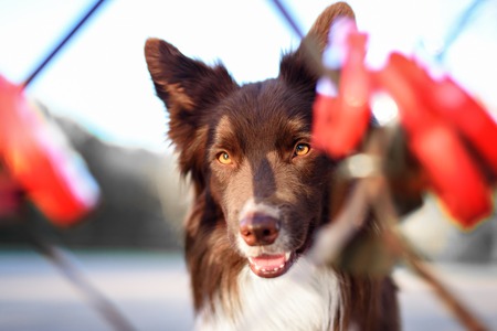 Red dog border collie portrait againt green backgroung
