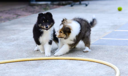 Shetland sheepdog (Shelties) puppy playing with litter mate.