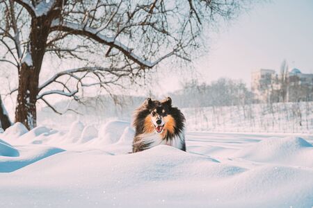 Funny Young Shetland Sheepdog, Sheltie, Collie Fast Running Outdoor In Snowy Park. Playful Pet In Winter Forest.