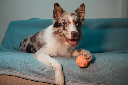 Red merle Border Collie lies on couch with paw on orange spiky ball, mouth open in happy expression. Happy dog wants to play indoor