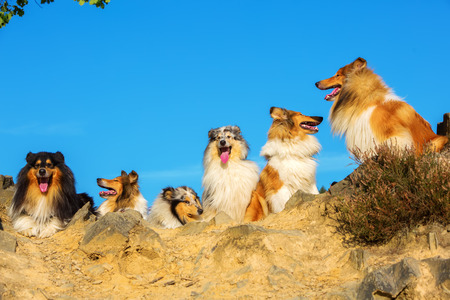 group of long hair collie dogs sitting on a hill