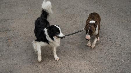 A border collie leads a bull terrier by the leash. One dog walking another