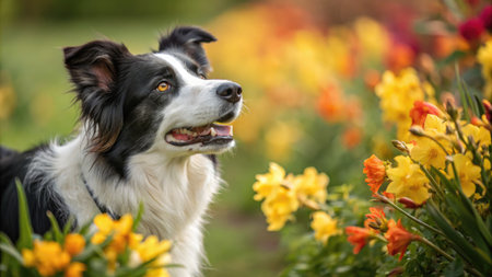 A beautiful border collie with a gentle gaze, surrounded by vibrant yellow and orange flowers, basking in natural light.