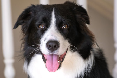cute happy dog border collie makes a funny pose and sticks his tongue