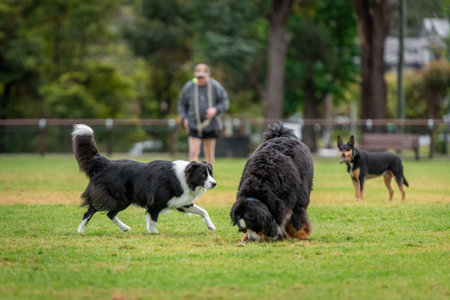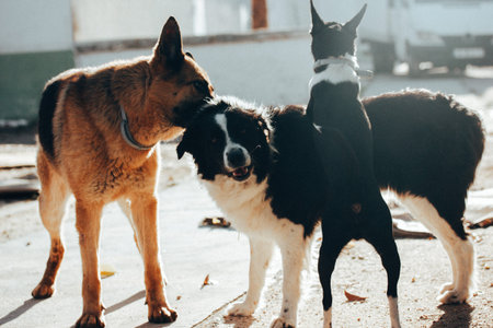 Three dogs, including a border collie and a small black and white dog, playing together. Happy dogs in a group.