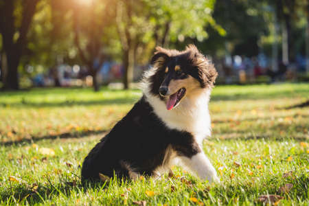 Happy dog lies on the grass. Shetland sheepdog in a summer park