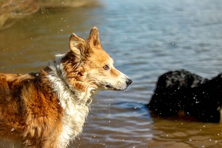 Adorable dog playing in the water and enjoying the warm weather. This orange dog is walking around in the lake whit his stick