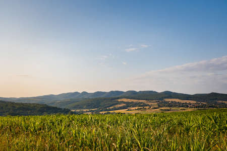 Rural landscape, Field of corn ready for harvest in the background the mountains with blue Sky with clouds.