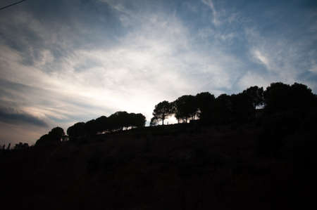 Hills panorama at sunset. Pines over hill. Minimal landscape