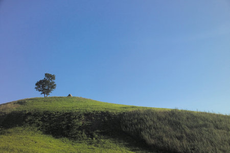 A stunning view of a solitary tree on a gently sloping hill, surrounded by dry grass under a clear sky. Ideal for showcasing the beauty of nature and tranquility.
