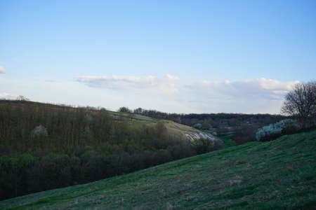 Panorama of the countryside at sunset in the evening light. Beautiful spring landscape in the mountains, rural landscapes.