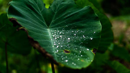 water droplets on green colacasia leaf during rainy season