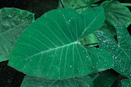 Tropical Green Leaves of Elephant Ear Plant with Raindrops in Dark Tone Color for Background