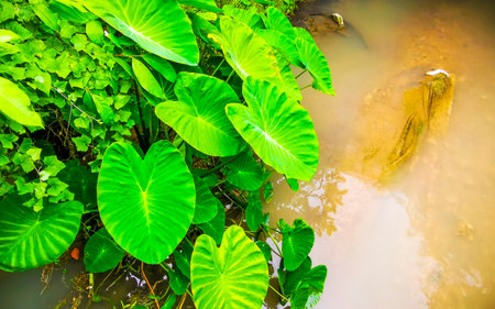 green taro leaves thrive near the water flow