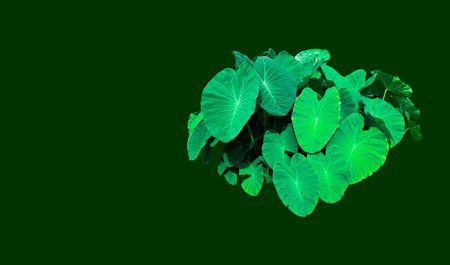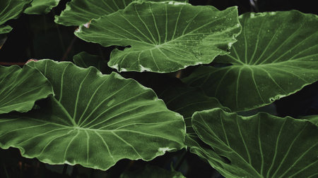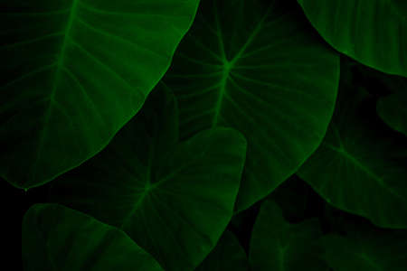 Closeup green leaves of elephant ear in jungle. Green leaf texture background with minimal pattern. Green leaves in tropical forest on dark background. Greenery wallpaper. Botanical garden in night.