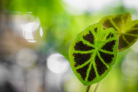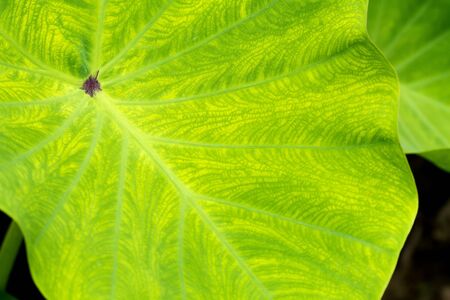 Close-up of Elephant ear leaf or Giant taro (Alocasia macrorrhizos), Natural background with sunlight.