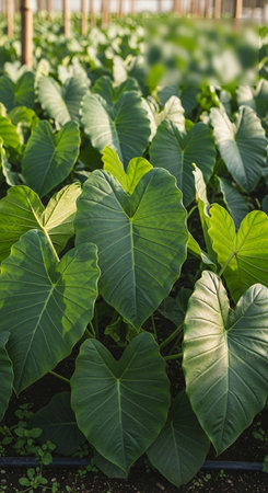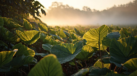 The Taro at dawn soft golden sunlight kissing leaves clean air natural color