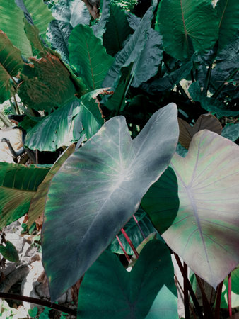 Tropical leaves of Alocasia esculenta in the garden
