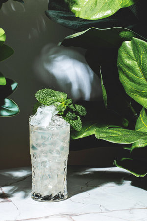 Close-up of a glass of mojito with lime and fresh mint. Lemonade with ice cubes on a marble table. A cup of cool citrus cocktail and a straw. Sour fizzy drink. Sunlight