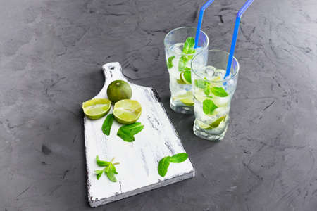 Mojito with lime, mint and ice cube on gray background.