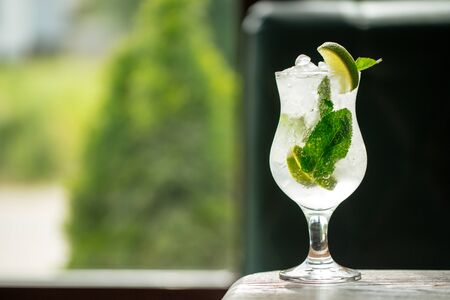Mojito cocktail with lime and mint and gin on bar counter
