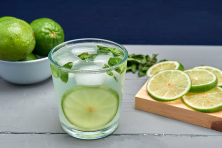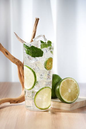 Glass of Mojito cocktail with mint and lime ice cubes with fresh limes. Sparkling refreshing water. Place for text