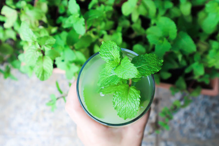 young girl's hand holding a glass with mohito lemonade cocktail in cafe