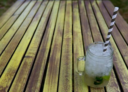 Refreshing cool mojito cocktail with ice and mint leaves in a glass with straw on the table, horizontal