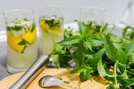 Drinking glasses on the table at the kitchen by the pile of lemon and mint herb ready for the mojito cocktail homemade