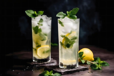 Glass of fresh mojito, lemons and mint on dark background