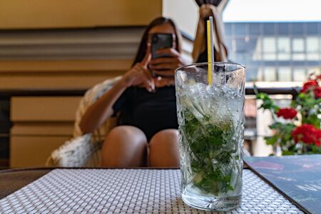 Photo of mojito cocktail stands on the table, the girl on the background sits in an armchair and holds the phone in her hands