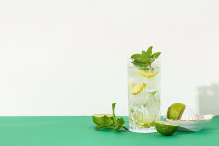 Glass of fresh mojito with juicer and lime on green table against white background