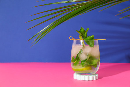 Glass of fresh mojito with tropical leaves on pink table against blue background