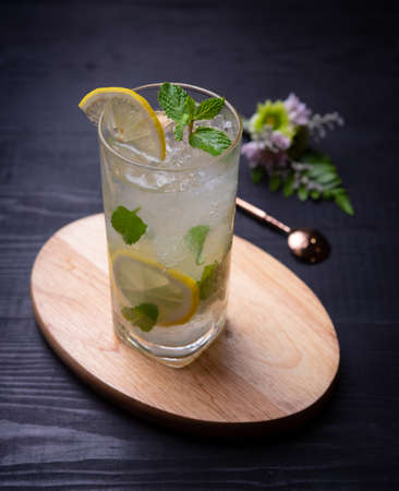 Tasty gin and tonic cocktail with slices of lemon and fresh mint on rustic background with copy space