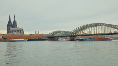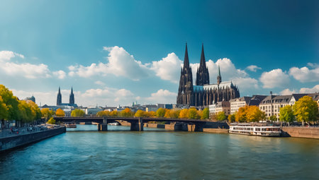 Scenic view of Cologne Cathedral and Hohenzollern Bridge across the Rhine River during autumnal season.