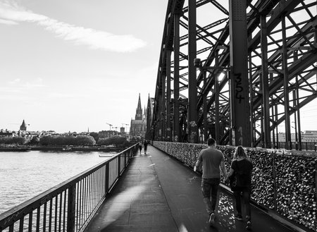 Walking over popular Hohenzollern Bridge in Cologne - CITY OF COLOGNE, GERMANY - JUNE 25, 2021