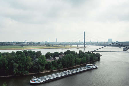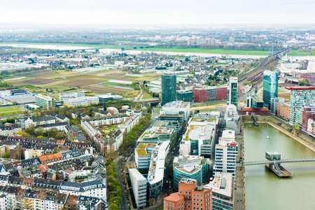 Wide angle picture of river Rhine, Duesseldorf. Seen from the television tower Rheinturm, Germany . Duesseldorf mediahafen (harbour) in Rheinland-Westphalia