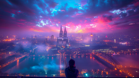 An awe-inspiring vision of the Cologne skyline with its iconic cathedral, overlaid by a breathtaking rainbow and dynamic twilight skies, capturing an ethereal urban scene.