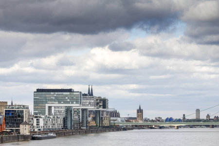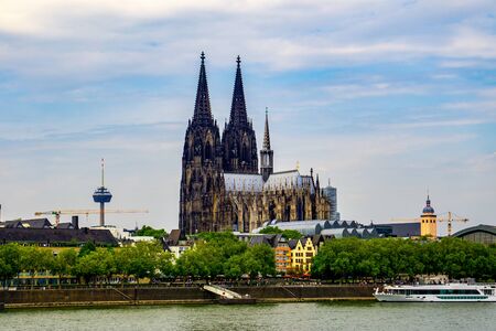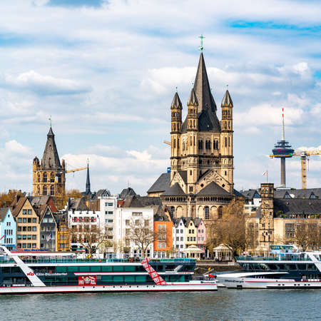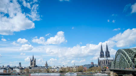 COLOGNE, GERMANY - April 17 2021: Cologne city skyline along the Rhine river, North Rhine-Westphalia, Germany