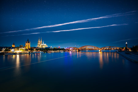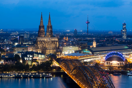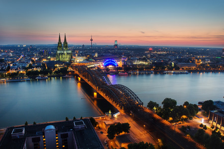 Cityscape of Cologne at twilight with the cathedral and Hoherzollern bridge